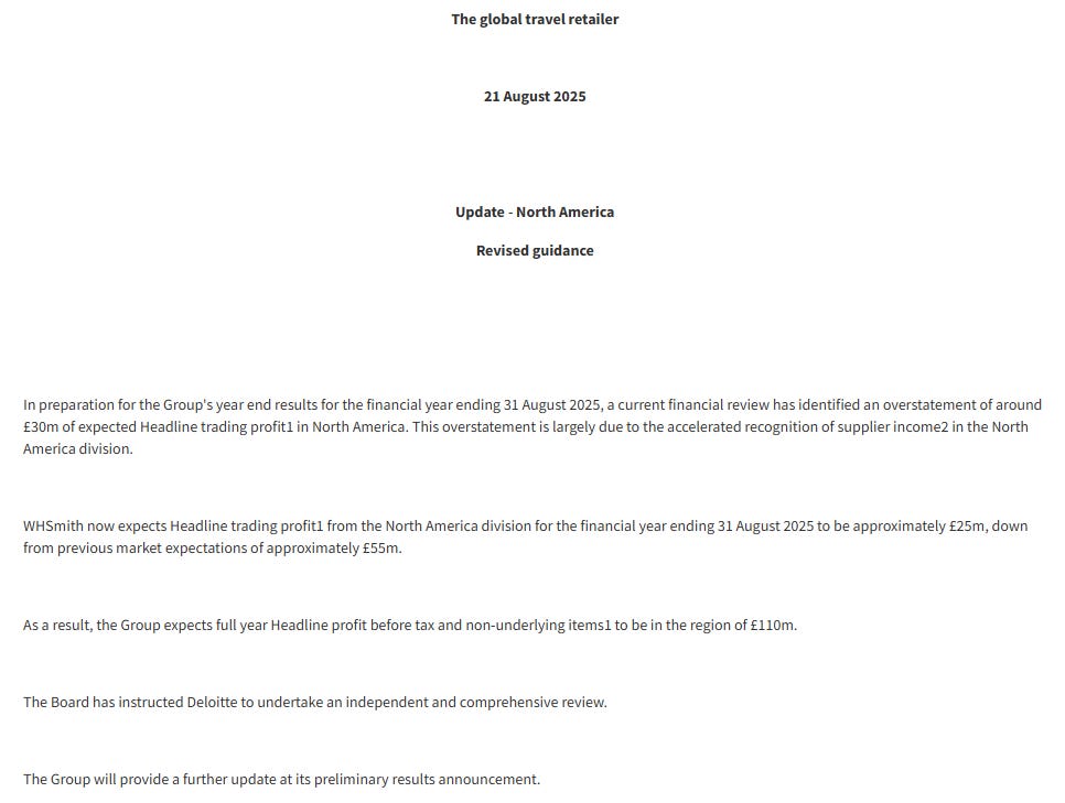 The catalyst for all this was a short, dry-looking announcement with the title "Update - North America". While getting ready for its year-end results, the company discovered it had "overstated" its expected profit in its North American business by about £30 million. This single admission forced WHSmith to cut its profit forecast for that division by more than half, from £55 million down to just £25 million. As a result, the total group profit for the year was now expected to be around £110 million, a nearly 35% drop from the £166 million it made the year before.